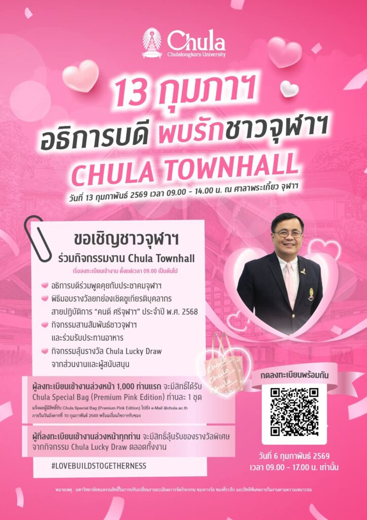 เปิดลงทะเบียนพร้อมกันในวันศุกร์ที่ 6 กุมภาพันธ์ 2569 เวลา 9.00 – 17.00 น. เท่านั้นที่: https://bit.ly/ChulaTownhall-FEB2026