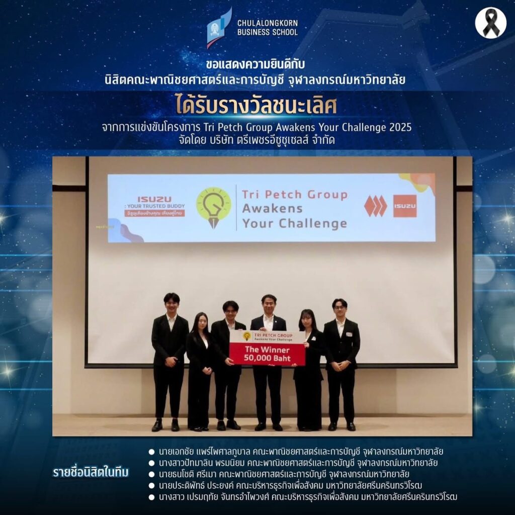 จุฬาลงกรณ์มหาวิทยาลัยขอแสดงความยินดีอย่างยิ่งกับนิสิตคณะพาณิชยศาสตร์และการบัญชี จุฬาฯ คว้ารางวัลชนะเลิศการปรกวดแผนกลุยุทธ์ทางธุรกิจ “Tri Petch Group Awakens Your Challenge 2025” ภายใต้หัวข้อ “ISUZU: Your Trusted Buddy อีซูซุเคียงข้างคุณ เคียงคู่ไทย” จัดโดยบริษัท ตรีเพชรอีซูซุเซลส์ จำกัด