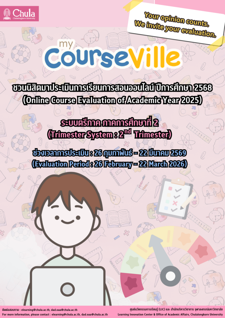 สำนักบริหารวิชาการ จุฬาฯ ร่วมกับศูนย์นวัตกรรมการเรียนรู้ จุฬาฯ ขอเชิญนิสิตจุฬาฯ ร่วมประเมินการเรียนการสอนออนไลน์ผ่านระบบ myCourseVille ในระบบตรีภาค ภาคการศึกษาที่ 2 ปีการศึกษา 2568