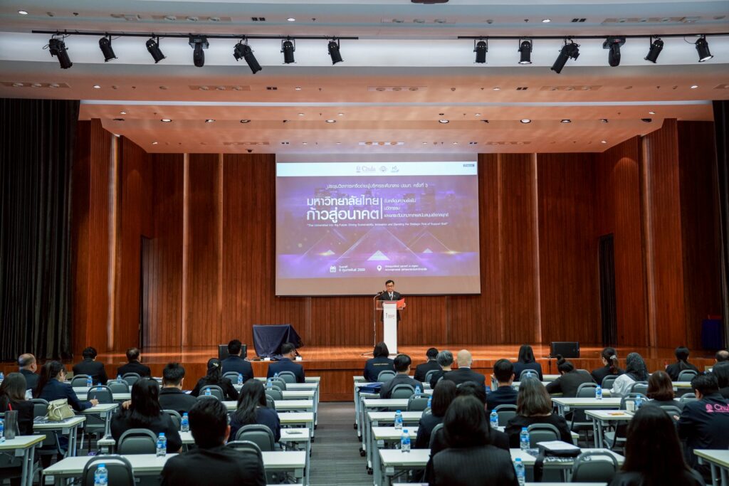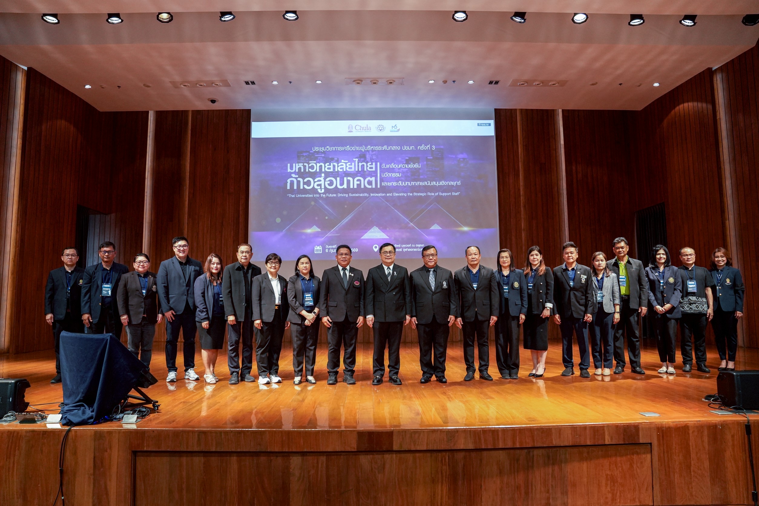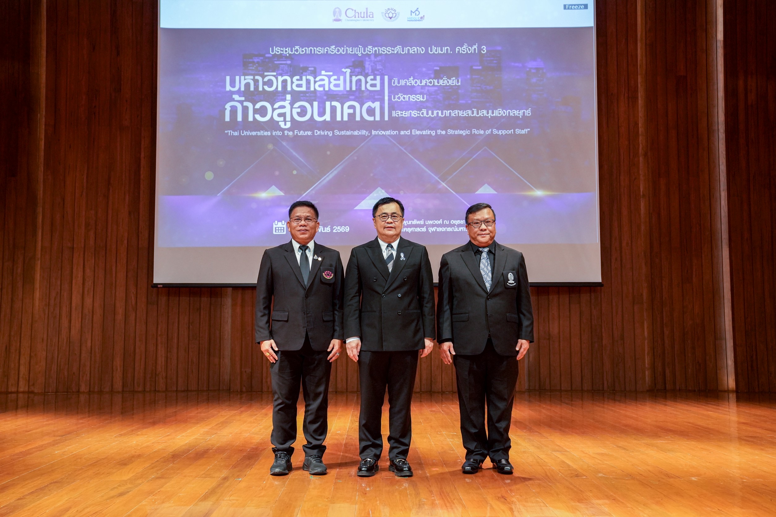 จุฬาลงกรณ์มหาวิทยาลัย ร่วมกับคณะกรรมการเครือข่ายผู้บริหารระดับกลาง ที่ประชุมสภาข้าราชการ พนักงาน และลูกจ้างมหาวิทยาลัยแห่งประเทศไทย (ปขมท.) จัดการประชุมวิชาการเครือข่ายผู้บริหารระดับกลาง ครั้งที่ 3 ประจำปี 2569 ภายใต้หัวข้อ“มหาวิทยาลัยไทยก้าวสู่อนาคต: ขับเคลื่อนความยั่งยืน นวัตกรรม และยกระดับบทบาทสายสนับสนุนเชิงกลยุทธ์” (Thai Universities into the Future: Driving Sustainability, Innovation and Elevating the Strategic Role of Support Staff) เมื่อวันศุกร์ที่ 6 กุมภาพันธ์ 2569 ณ ห้องพูนทรัพย์ นพวงศ์ ณ อยุธยา คณะครุศาสตร์ จุฬาฯ โดยมี ศ.ดร.วิเลิศ ภูริวัชร อธิการบดีจุฬาลงกรณ์มหาวิทยาลัย กล่าวเปิดงานและแสดงปาฐกถาพิเศษในหัวข้อ “The Future-Ready University : ผู้นำยุคใหม่กับการบริหารมหาวิทยาลัยในโลกที่เปลี่ยนไป” นายเรวัต รัตนกาญจน์ ประธานเครือข่ายผู้บริหารระดับกลาง ปขมท. กล่าวต้อนรับผู้เข้าร่วมงาน และ รศ.ดร.ศิริเดช สุชีวะ รองอธิการบดี จุฬาฯ กล่าวรายงานวัตถุประสงค์ของการจัดประชุม