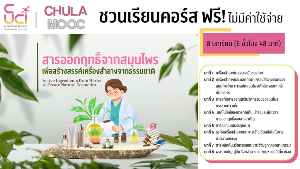 จุฬาลงกรณ์มหาวิทยาลัย เปิดให้ลงทะเบียนเรียนออนไลน์ในรายวิชา “สารออกฤทธิ์จากสมุนไพรเพื่อสร้างสรรค์เครื่องสำอางจากธรรมชาติ” ผ่านแพลตฟอร์ม CHULA MOOC โดยมีความร่วมมือระหว่าง จุฬาลงกรณ์มหาวิทยาลัย, บริษัท สเปเชี่ยลตี้ เนเชอรัล โปรดักส์ จำกัด (มหาชน) และ สำนักงานคณะกรรมการอาหารและยา (อย.) เป็นสื่อการเรียนรู้ออนไลน์ที่ออกแบบมาเพื่อส่งเสริมการเรียนรู้ตลอดชีวิตให้กับนิสิต และบุคคลทั่วไปที่สนใจเรียนรู้ในด้านสารสมุนไพร เทคโนโลยีเครื่องสำอาง และการสร้างมูลค่าเพิ่มให้กับทรัพยากรธรรมชาติของไทย