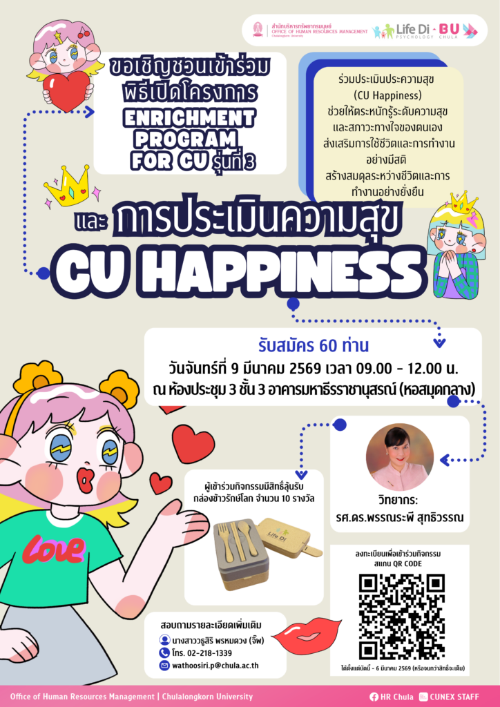 สำนักบริหารทรัพยากรมนุษย์ ร่วมกับศูนย์จิตวิทยาพัฒนาการและความสัมพันธ์ระหว่างวัย จุฬาฯ (Life Di) คณะจิตวิทยา ภายใต้โครงการ Chula Preventive Health Care ขอเชิญชวนชาวจุฬาฯ เข้าร่วมพิธีเปิดโครงการ Enrichment Program for CU รุ่นที่ 3 และการประเมินความสุข (CU Happiness) ในวันจันทร์ที่ 9 มีนาคม 2569 เวลา 08.30 – 12.00 น. ณ ห้องประชุม 3 ชั้น 3 อาคารมหาธีรราชานุสรณ์ (หอสมุดกลาง)