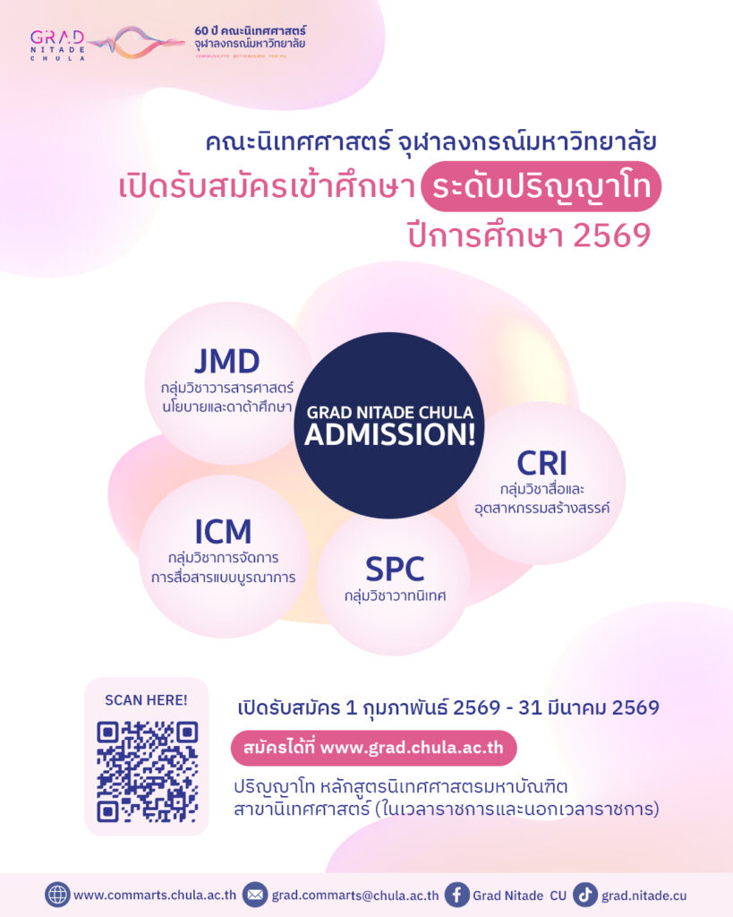 คณะนิเทศศาสตร์ จุฬาลงกรณ์มหาวิทยาลัย เปิดรับสมัครผู้สนใจเข้าศึกษาต่อในระดับบัณฑิตศึกษา ประจำปีการศึกษา 2569 ทั้งระดับปริญญาโทและปริญญาเอก รายละเอียดดังนี้