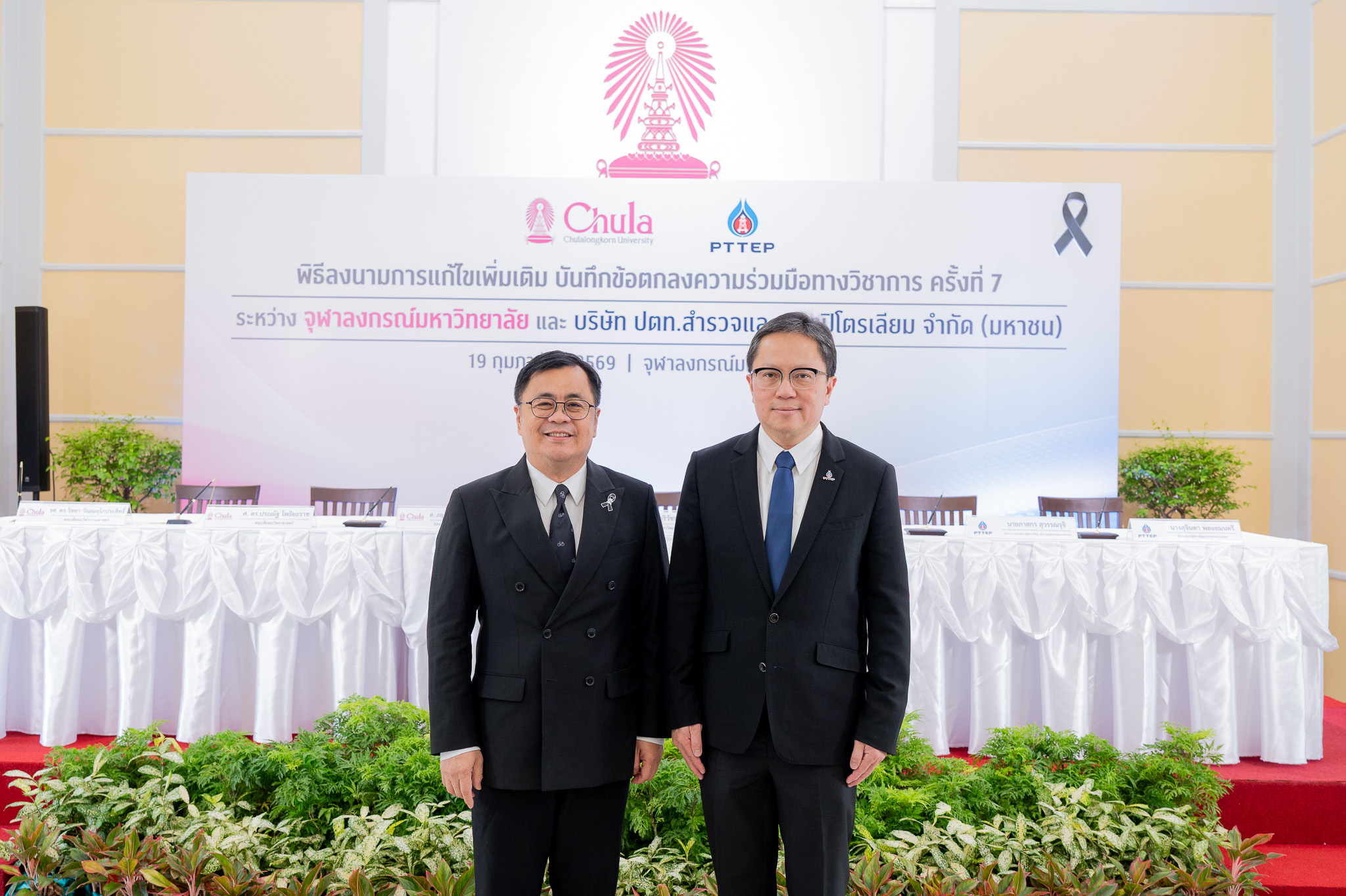 จุฬาลงกรณ์มหาวิทยาลัยและบริษัท ปตท.สำรวจและผลิตปิโตรเลียม จำกัด (มหาชน) จัดพิธีลงนามบันทึกข้อตกลงความร่วมมือทางวิชาการ ครั้งที่ 7 โดยมี ศ.ดร.วิเลิศ ภูริวัชร อธิการบดีจุฬาลงกรณ์มหาวิทยาลัย และนายพีระพงศ์ ไชยลาโภ รักษาการรองกรรมการผู้จัดการใหญ่ กลุ่มงานวิศวกรรมศาสตร์ การพัฒนา และบำรุงรักษา บริษัท ปตท.สำรวจและผลิตปิโตรเลียม จำกัด (มหาชน) หรือ ปตท.สผ. ร่วมลงนามบันทึกความร่วมมือทางวิชาการ เมื่อวันที่ 19 กุมภาพันธ์ 2569 ณ เรือนจุฬานฤมิต