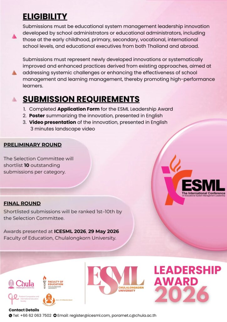 คณะครุศาสตร์ จุฬาลงกรณ์มหาวิทยาลัย โดยสาขาวิชาภาวะผู้นำการบริหารระบบการศึกษา ภาควิชานโยบาย การจัดการและความเป็นผู้นำทางการศึกษา ขอเชิญผู้บริหารสถานศึกษาและผู้บริหารการศึกษาส่งผลงาน “นวัตกรรมทางการบริหารระบบการศึกษา” เข้าร่วมประกวดโครงการ “รางวัลผู้นำการบริหารระบบการศึกษา: ESML Leadership Award” สำหรับผู้บริหารสถานศึกษาและผู้บริหารการศึกษาทุกสังกัด