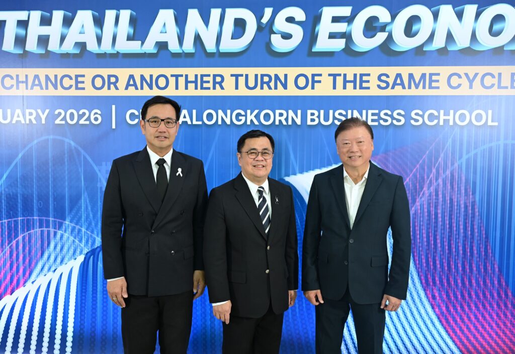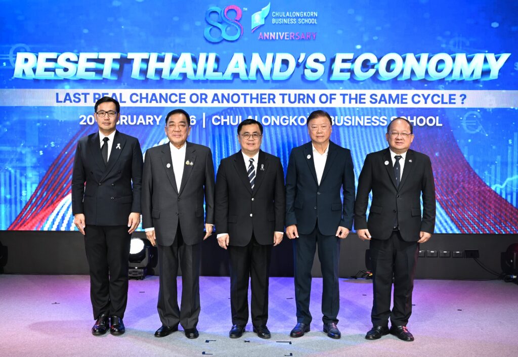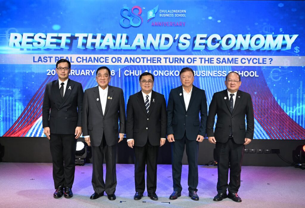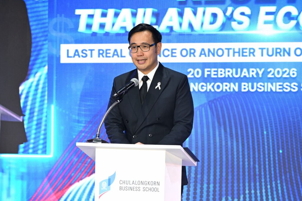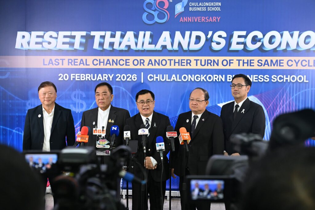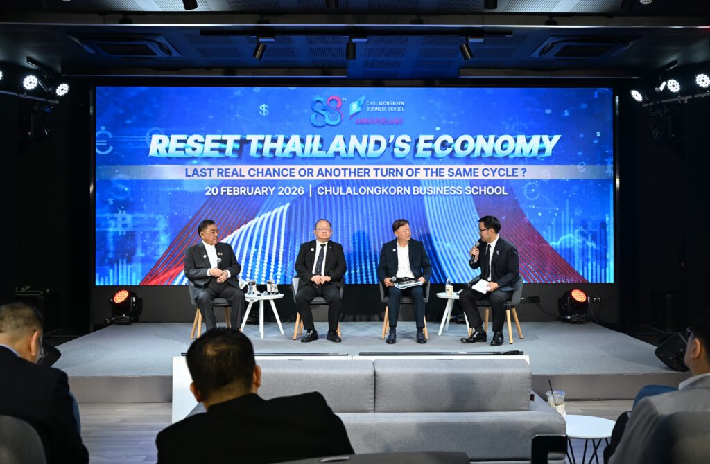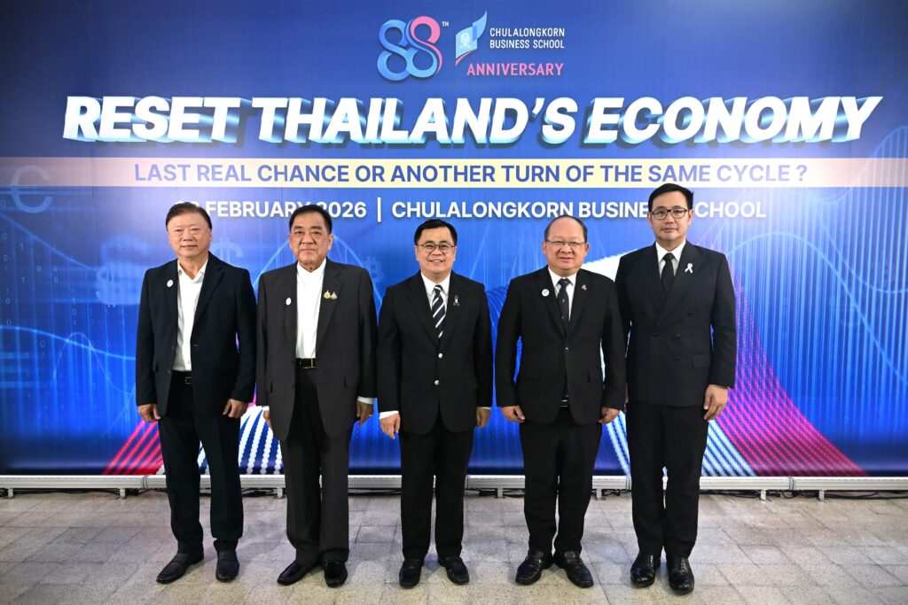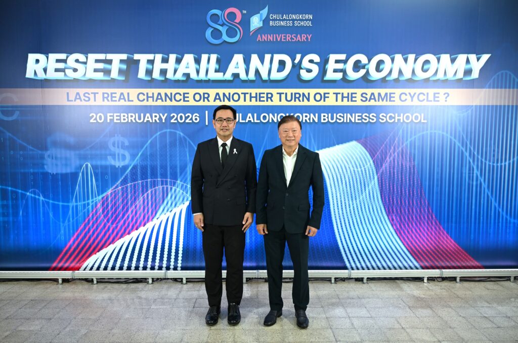 คณะพาณิชยศาสตร์และการบัญชี จุฬาลงกรณ์มหาวิทยาลัย เปิดเวทีวิเคราะห์ทิศทางเศรษฐกิจไทยท่ามกลางความผันผวนของเศรษฐกิจโลก ปัญหาเชิงโครงสร้าง และข้อจำกัดด้านขีดความสามารถการแข่งขัน ในงานเสวนาวิชาการ หัวข้อ “รีเซ็ตเศรษฐกิจไทย: โอกาสสุดท้ายหรือแค่รอบใหม่ของวงจรเดิม?” (Reset Thailand’s Economy: Last Real Chance or Another Turn of the Same Cycle?) เมื่อวันที่ 20 กุมภาพันธ์ 2569 ณ CBS Cinema ชั้น 3 อาคารไชยยศสมบัติ 1 คณะพาณิชยศาสตร์และการบัญชี จุฬาฯ โดยมี ศ.ดร.วิเลิศ ภูริวัชร อธิการบดีจุฬาฯ เป็นประธานกล่าวเปิดงาน ดร.พจน์ อร่ามวัฒนานนท์ ประธานกรรมการหอการค้าไทยและสภาหอการค้าแห่งประเทศไทย คุณเกรียงไกร เธียรนุกุล ประธานสภาอุตสาหกรรมแห่งประเทศไทย คุณธนากร เกษตรสุวรรณ ประธานสภาผู้ส่งสินค้าทางเรือแห่งประเทศไทย (สรท.) ร่วมเสวนา ดำเนินรายการโดย รศ.ดร.ธารทัศน์ โมกขมรรคกุล คณบดีคณะพาณิชยศาสตร์และการบัญชี จุฬาฯ