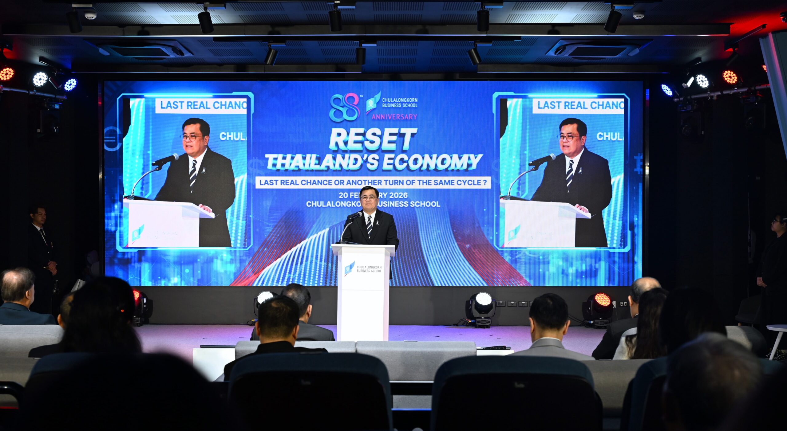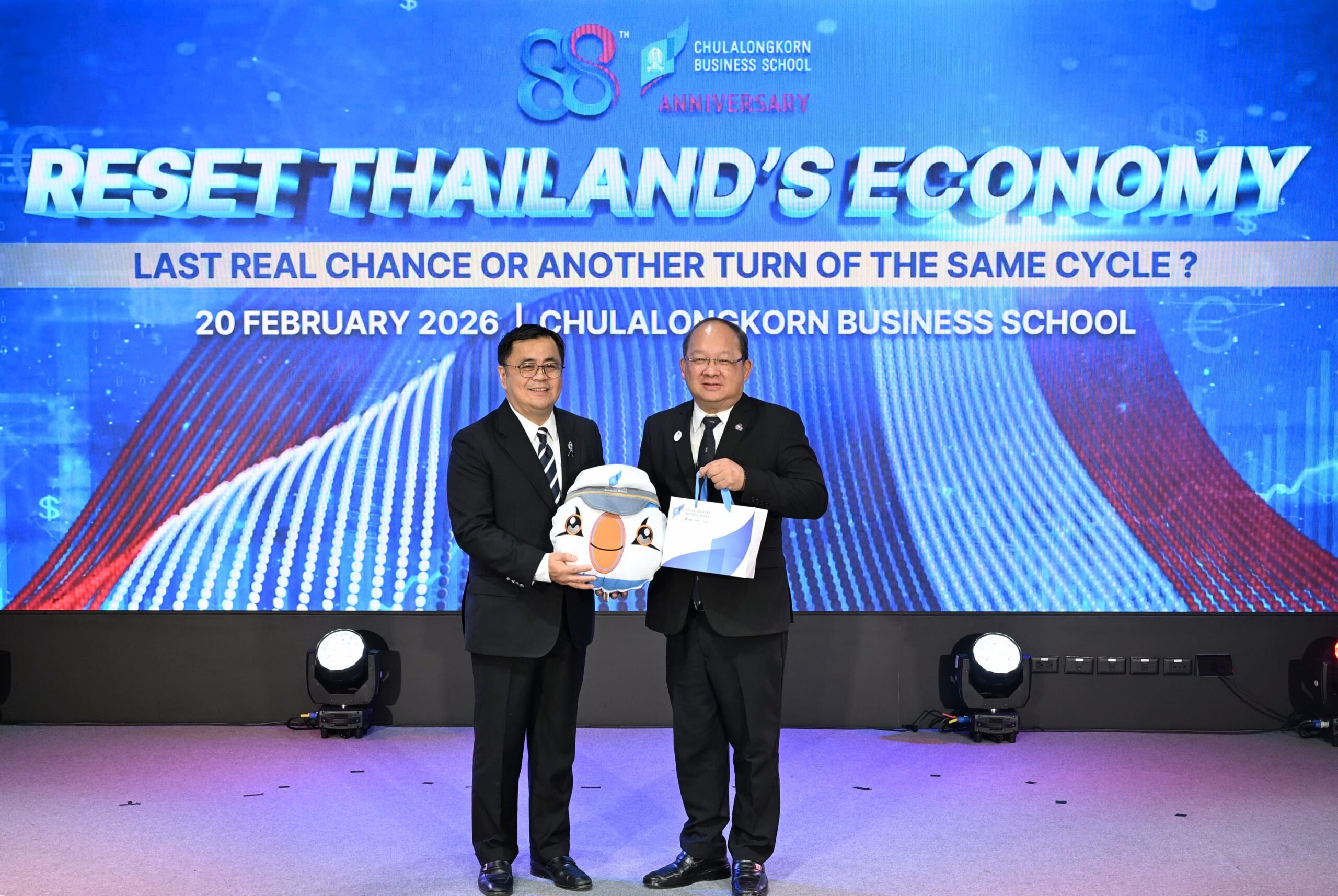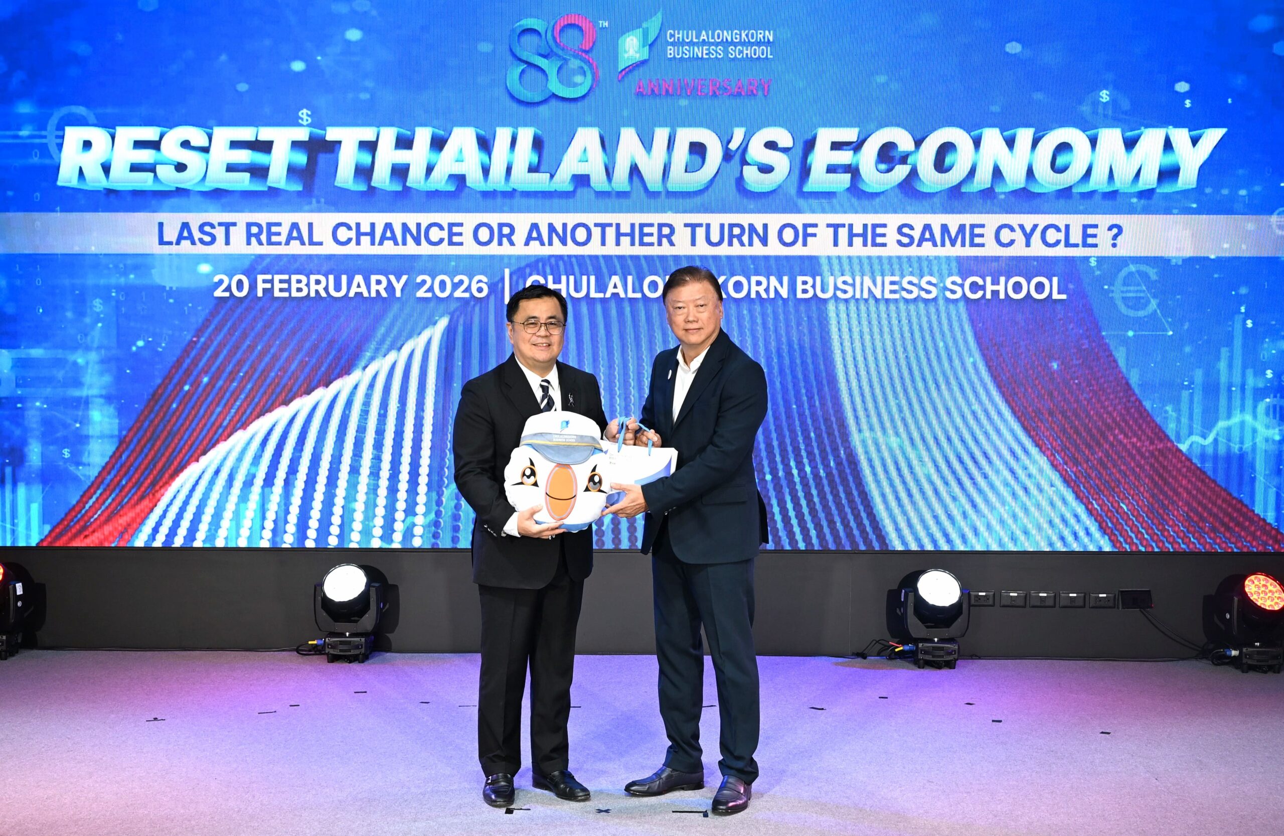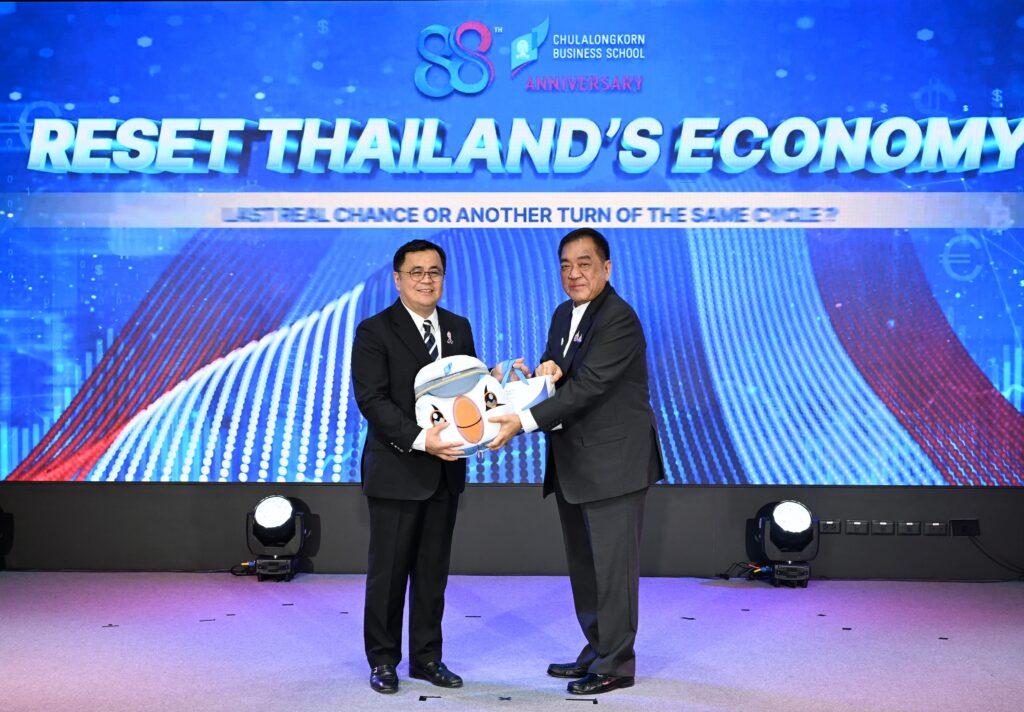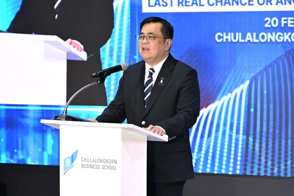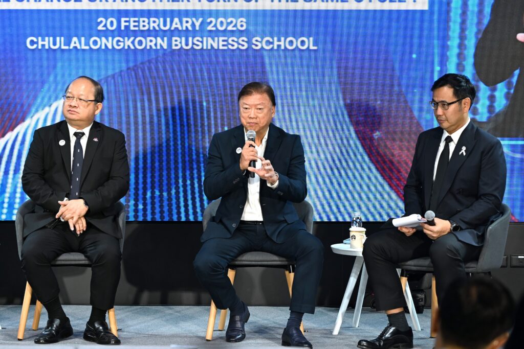คณะพาณิชยศาสตร์และการบัญชี จุฬาลงกรณ์มหาวิทยาลัย เปิดเวทีวิเคราะห์ทิศทางเศรษฐกิจไทยท่ามกลางความผันผวนของเศรษฐกิจโลก ปัญหาเชิงโครงสร้าง และข้อจำกัดด้านขีดความสามารถการแข่งขัน ในงานเสวนาวิชาการ หัวข้อ “รีเซ็ตเศรษฐกิจไทย: โอกาสสุดท้ายหรือแค่รอบใหม่ของวงจรเดิม?” (Reset Thailand’s Economy: Last Real Chance or Another Turn of the Same Cycle?) เมื่อวันที่ 20 กุมภาพันธ์ 2569 ณ CBS Cinema ชั้น 3 อาคารไชยยศสมบัติ 1 คณะพาณิชยศาสตร์และการบัญชี จุฬาฯ โดยมี ศ.ดร.วิเลิศ ภูริวัชร อธิการบดีจุฬาฯ เป็นประธานกล่าวเปิดงาน ดร.พจน์ อร่ามวัฒนานนท์ ประธานกรรมการหอการค้าไทยและสภาหอการค้าแห่งประเทศไทย คุณเกรียงไกร เธียรนุกุล ประธานสภาอุตสาหกรรมแห่งประเทศไทย คุณธนากร เกษตรสุวรรณ ประธานสภาผู้ส่งสินค้าทางเรือแห่งประเทศไทย (สรท.) ร่วมเสวนา ดำเนินรายการโดย รศ.ดร.ธารทัศน์ โมกขมรรคกุล คณบดีคณะพาณิชยศาสตร์และการบัญชี จุฬาฯ