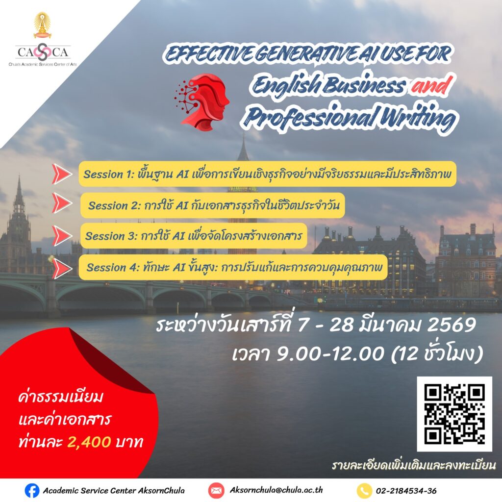 – Effective Generative AI Use for English Business and Professional Writing (Online)เรียนรู้การใช้ Generative AI อย่างมีประสิทธิภาพ เพื่อยกระดับงานเขียนและการทำงานยุคใหม่