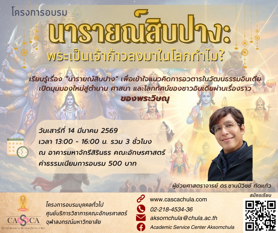 – “นารายณ์สิบปาง : พระเป็นเจ้าก้าวลงมาในโลกทำไม?” (On-site)ทำความเข้าใจปกรณัมอินเดียในมุมมองใหม่