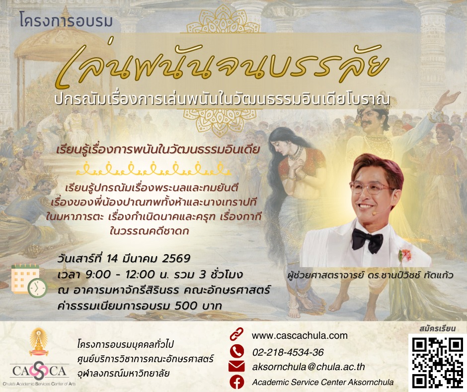 – “เล่นพนันจนบรรลัย … ปกรณัมเรื่องการเล่นพนันในวัฒนธรรมอินเดียโบราณ” (On-site)ถอดบทเรียนจากเรื่องเล่าโบราณที่สะท้อนสังคมและศีลธรรม