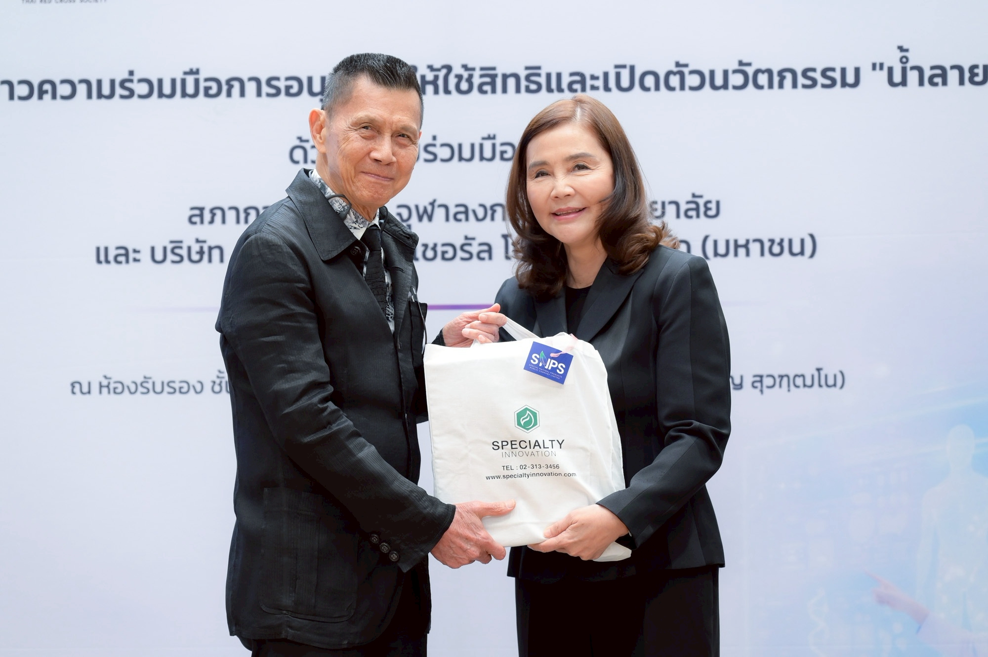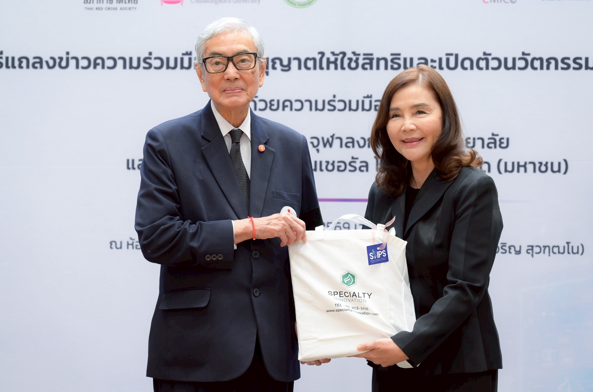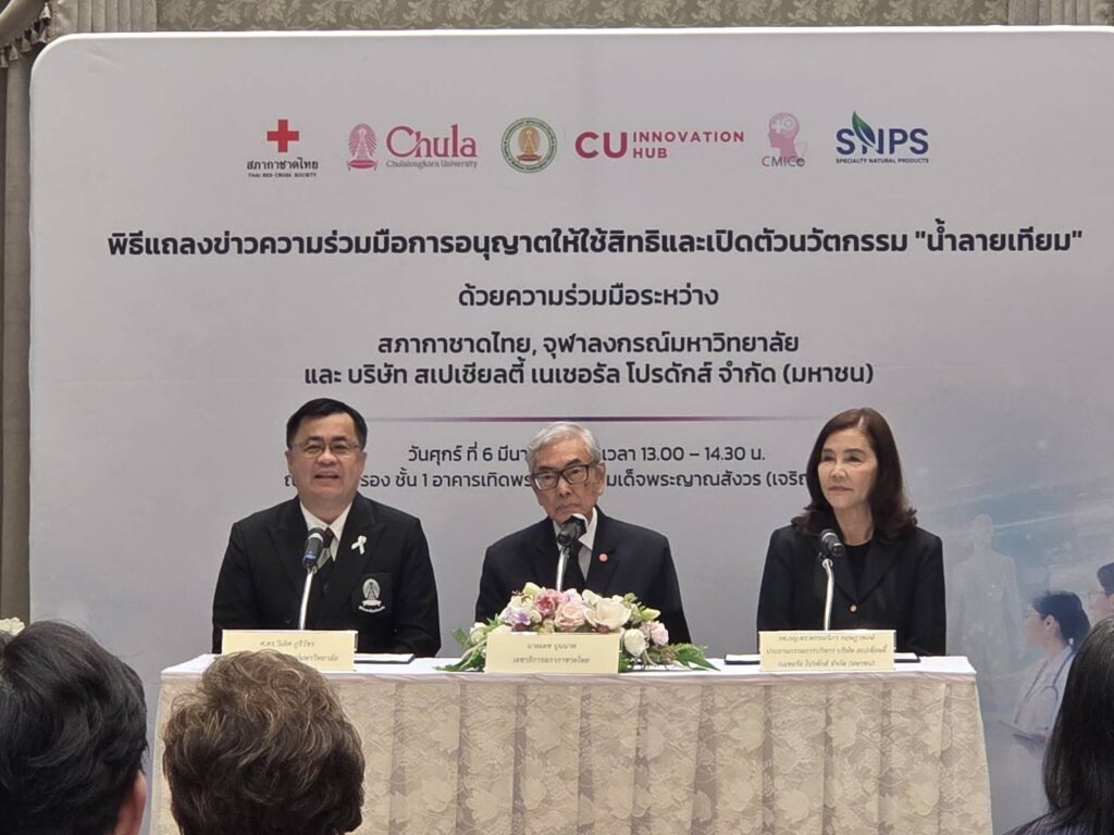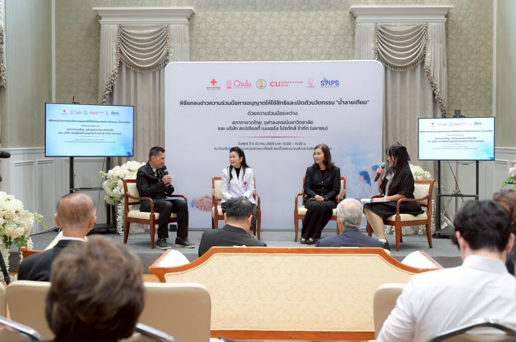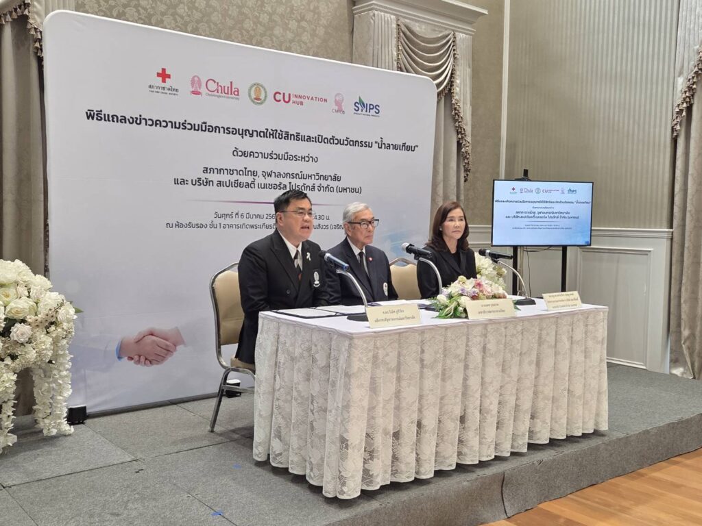 งานแถลงข่าวจัดขึ้นเมื่อวันที่ 6 มีนาคม 2569 ณ ห้องรับรอง ชั้น 1 อาคารเทิดพระเกียรติ สมเด็จพระญาณสังวร (เจริญ สุวฑฺฒโน) สภากาชาดไทย โดยมี ศ.ดร.วิเลิศ ภูริวัชร อธิการบดีจุฬาฯ นายเตช บุนนาค เลขาธิการสภากาชาดไทย และ รศ.ดร.พรรณวิภา กฤษฎาพงษ์ กรรมการผู้จัดการ บริษัท สเปเชียลตี้ อินโนเวชั่น จำกัด ร่วมแถลงถึงเป้าหมายของความร่วมมือในการผลักดันนวัตกรรมไทยสู่สังคม พร้อมทั้งแสดงเจตนารมณ์ในการอนุญาตให้ใช้สิทธิในผลงานวิจัยและการพัฒนาผลิตภัณฑ์สู่การผลิตในระดับอุตสาหกรรม