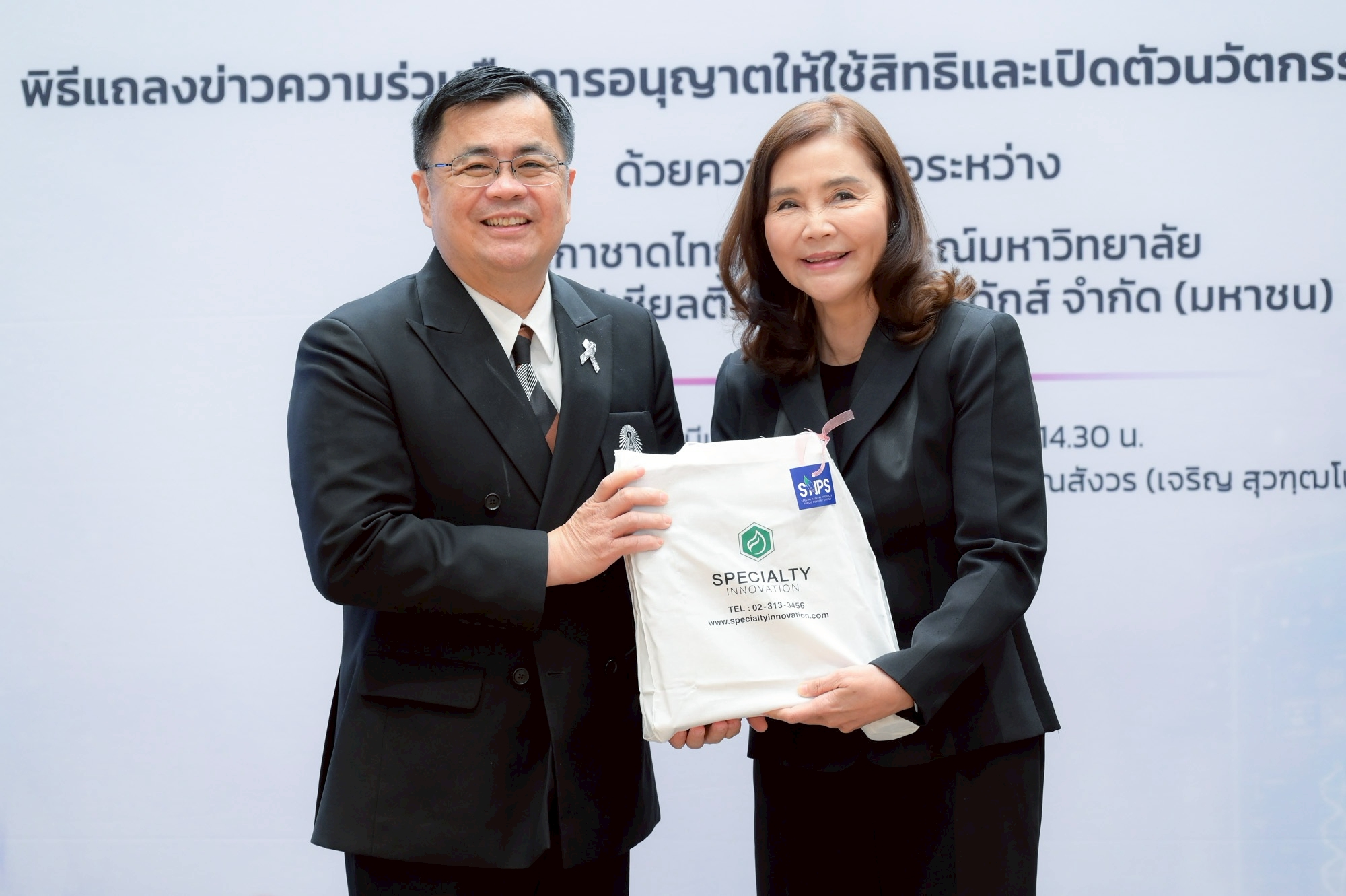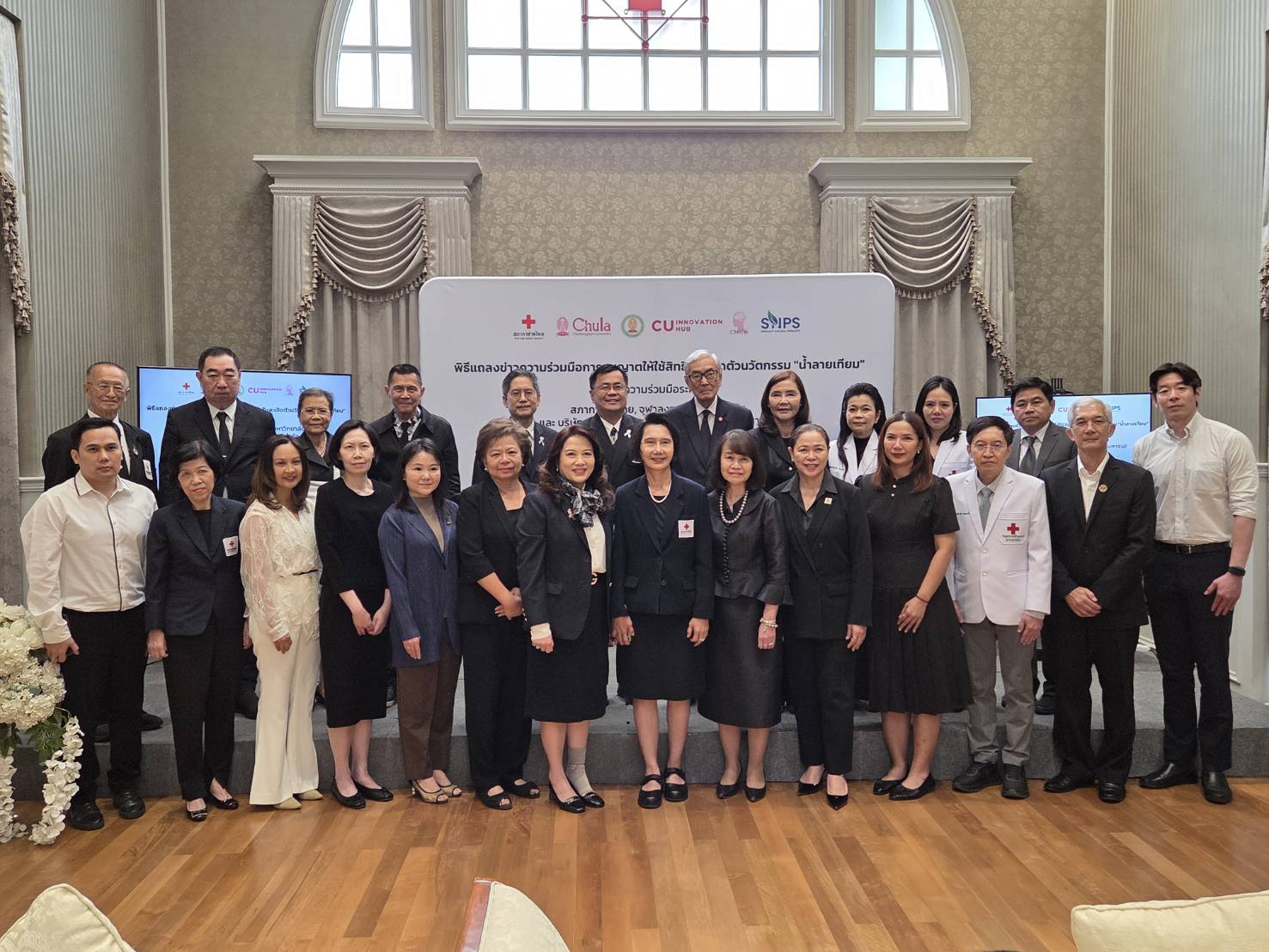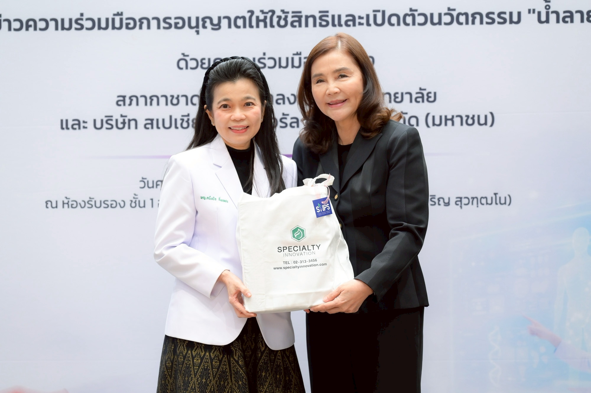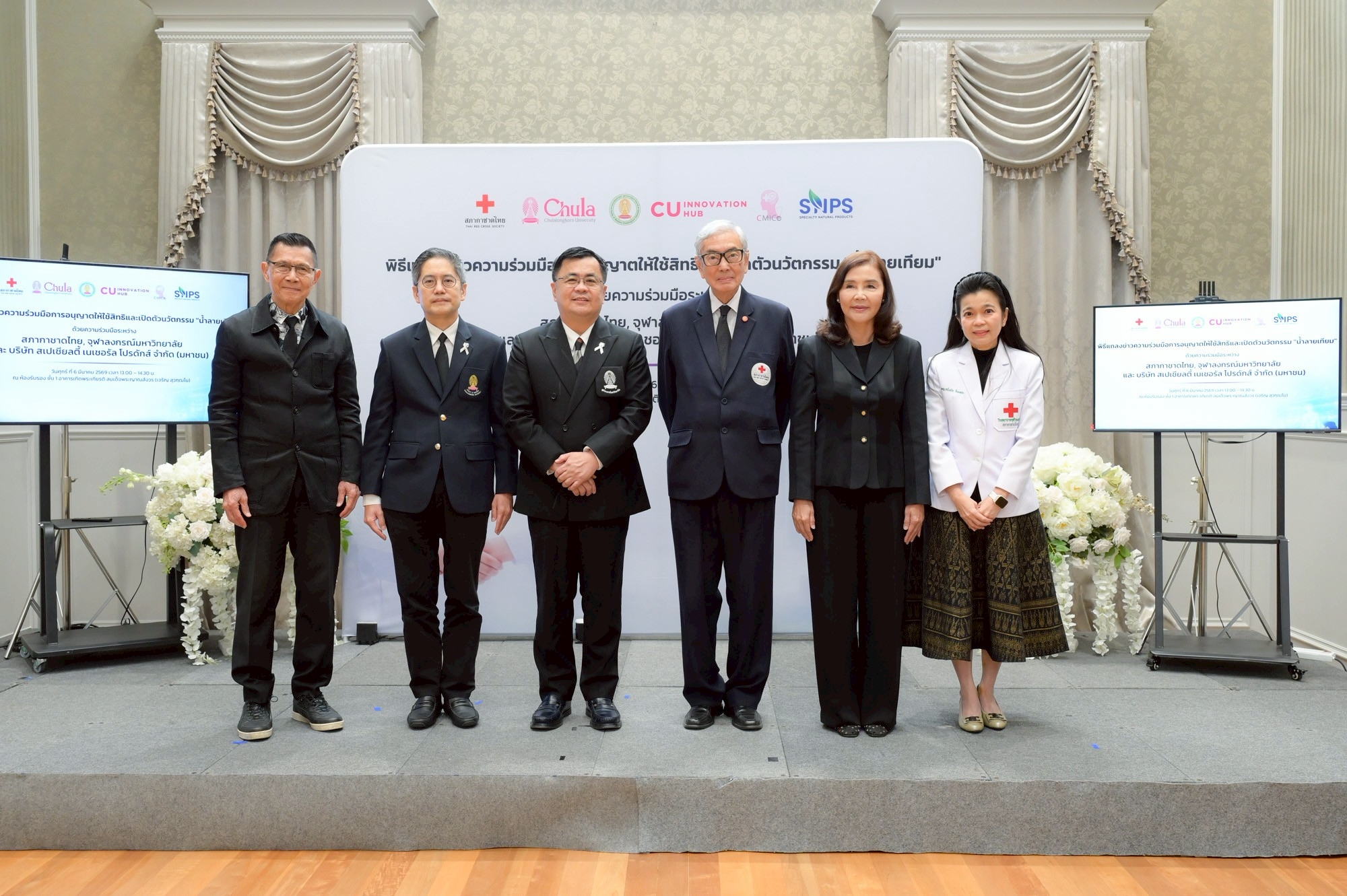 งานแถลงข่าวจัดขึ้นเมื่อวันที่ 6 มีนาคม 2569 ณ ห้องรับรอง ชั้น 1 อาคารเทิดพระเกียรติ สมเด็จพระญาณสังวร (เจริญ สุวฑฺฒโน) สภากาชาดไทย โดยมี ศ.ดร.วิเลิศ ภูริวัชร อธิการบดีจุฬาฯ นายเตช บุนนาค เลขาธิการสภากาชาดไทย และ รศ.ดร.พรรณวิภา กฤษฎาพงษ์ กรรมการผู้จัดการ บริษัท สเปเชียลตี้ อินโนเวชั่น จำกัด ร่วมแถลงถึงเป้าหมายของความร่วมมือในการผลักดันนวัตกรรมไทยสู่สังคม พร้อมทั้งแสดงเจตนารมณ์ในการอนุญาตให้ใช้สิทธิในผลงานวิจัยและการพัฒนาผลิตภัณฑ์สู่การผลิตในระดับอุตสาหกรรม