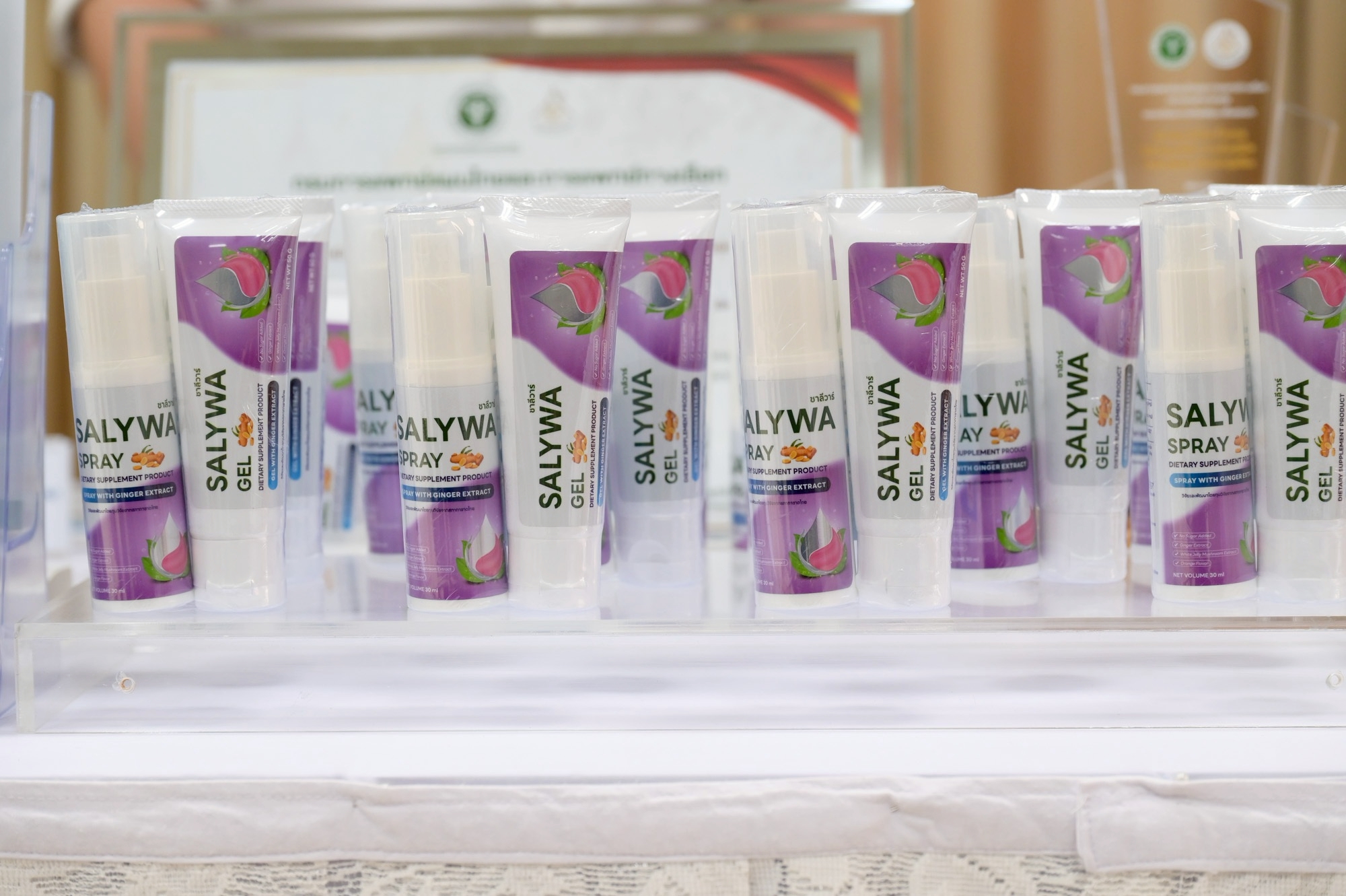 “SALYWA” นวัตกรรม “น้ำลายเทียม” พัฒนาขึ้นจากผลงานวิจัยของ รศ.พญ.คนึงนิจ กิ่งเพชร และคณะ จากคณะแพทยศาสตร์ จุฬาฯ ซึ่งได้รับการคุ้มครองภายใต้อนุสิทธิบัตรของจุฬาลงกรณ์มหาวิทยาลัยและสภากาชาดไทย พัฒนาจากสารสกัดสมุนไพรไทย โดยเฉพาะสารสกัดจากขิงที่ช่วยกระตุ้นการหลั่งน้ำลายตามธรรมชาติ และออกแบบด้วยแนวคิด Dual-Action ที่ช่วยทั้งเคลือบและเพิ่มความชุ่มชื้นในช่องปาก ทำให้รู้สึกสบายและสดชื่นหลังใช้
