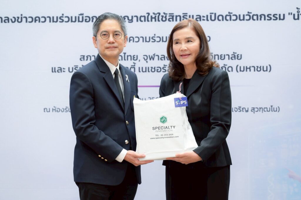 รศ.ดร.พรรณวิภา กฤษฎาพงษ์ กรรมการผู้จัดการ บริษัท สเปเชียลตี้ อินโนเวชั่น จำกัด เผยว่าความร่วมมือระหว่างนักวิจัยจุฬาฯ และภาคอุตสาหกรรมนี้สามารถต่อยอดองค์ความรู้จากงานวิจัยสู่ผลิตภัณฑ์สุขภาพที่นำไปใช้ได้จริง ผลิตภัณฑ์ดังกล่าวมีเป้าหมายสำคัญในการช่วยบรรเทาภาวะปากแห้งในผู้ป่วยมะเร็งและผู้ป่วยที่มีปัญหาต่อมน้ำลาย เพื่อให้ผู้ป่วยสามารถรับประทานอาหาร สื่อสารกับผู้อื่น และดำรงชีวิตได้อย่างมีคุณภาพ เป็นการนำองค์ความรู้ทางวิทยาศาสตร์มาพัฒนานวัตกรรมเพื่อประโยชน์ต่อสังคม โดยโครงการนี้สร้างคุณค่าเชิงบวกใน 3 มิติ ได้แก่ การยกระดับคุณภาพชีวิตของผู้ป่วยด้วยผลิตภัณฑ์ที่มีส่วนประกอบจากสารสกัดธรรมชาติที่ปลอดภัย การลดการนำเข้าผลิตภัณฑ์จากต่างประเทศและเพิ่มมูลค่าทรัพย์สินทางปัญญาของนักวิจัยไทย พร้อมเปิดโอกาสขยายสู่ตลาดระดับภูมิภาคในราคาที่เหมาะสม ตลอดจนการสร้างต้นแบบความร่วมมือที่ช่วยผลักดันงานวิจัยจากห้องปฏิบัติการไปสู่การผลิตเชิงอุตสาหกรรมได้อย่างเป็นระบบและยั่งยืน