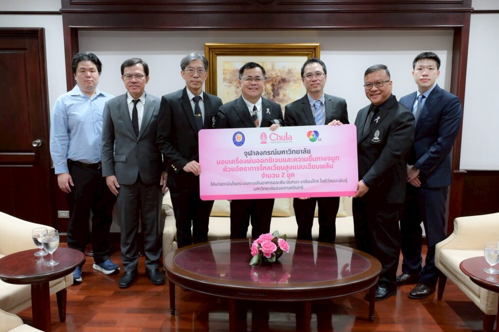 นอกจากนี้ จุฬาลงกรณ์มหาวิทยาลัยได้ร่วมบริจาคเครื่องพ่นออกซิเจนและความชื้นทางจมูก อัตราการไหลสูงแบบเฉียบพลัน (HFNC) จำนวน 2 ชุดให้แก่สถาบันโรคระบบทางเดินอาหารและตับ นันทนา-เกรียงไกร โชติวัฒนะพันธุ์ มหาวิทยาลัยสงขลานครินทร์ เพื่อสนับสนุนการช่วยเหลือผู้ประสบอุทกภัย โดยมี นพ.จักรสิน โสตถิสุพร นายแพทย์ประจำสถาบันโรคทางเดินอาหารและตับ NKC โรงพยาบาลสงขลานครินทร์ คณะแพทยศาสตร์ มหาวิทยาลัยสงขลานครินทร์ ร่วมรับมอบ