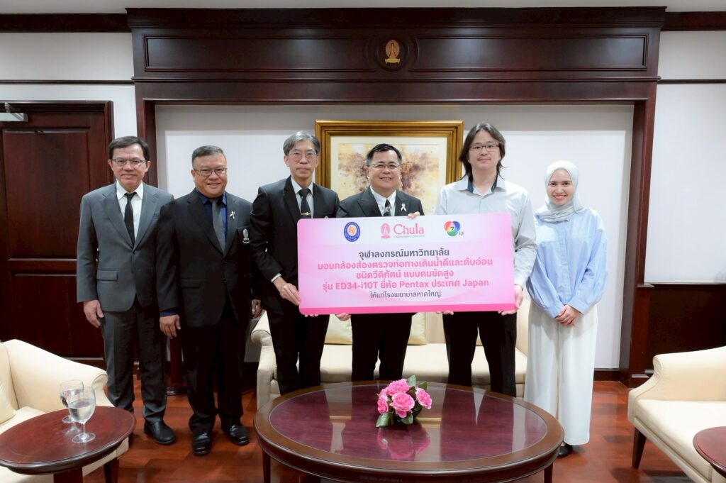 เมื่อวันที่ 6 มีนาคม 2569 ณ ห้องรับรองชั้น 7 อาคารจามจุรี 4 ศ.ดร.วิเลิศ ภูริวัชร อธิการบดีจุฬาฯ พร้อมด้วยผู้บริหารมหาวิทยาลัยร่วมพิธีมอบกล้องส่องตรวจท่อทางเดินน้ำดีและตับอ่อนชนิดวีดิทัศน์แบบคมชัดสูง รุ่น ED34-i10T ยี่ห้อ Pentax ให้แก่โรงพยาบาลหาดใหญ่ เพื่อใช้ในการตรวจและรักษาผู้ป่วยอย่างทันท่วงที และเพิ่มประสิทธิภาพในการให้บริการทางการแพทย์ เนื่องจากสถานการณ์อุทกภัย ส่งผลให้เกิดความเสียหายต่ออุปกรณ์และเครื่องมือทางการแพทย์ โดยมี นพ.จิรัชย์ จิรธรรมโอภาส นายแพทย์ชำนาญการพิเศษ แผนกศัลยกรรม โรงพยาบาลหาดใหญ่ และคุณณัฎฐรี จิตภาค พยาบาลวิชาชีพปฏิบัติการห้องส่องกล้อง แผนกศัลยกรรม โรงพยาบาลหาดใหญ่ ร่วมรับมอบ