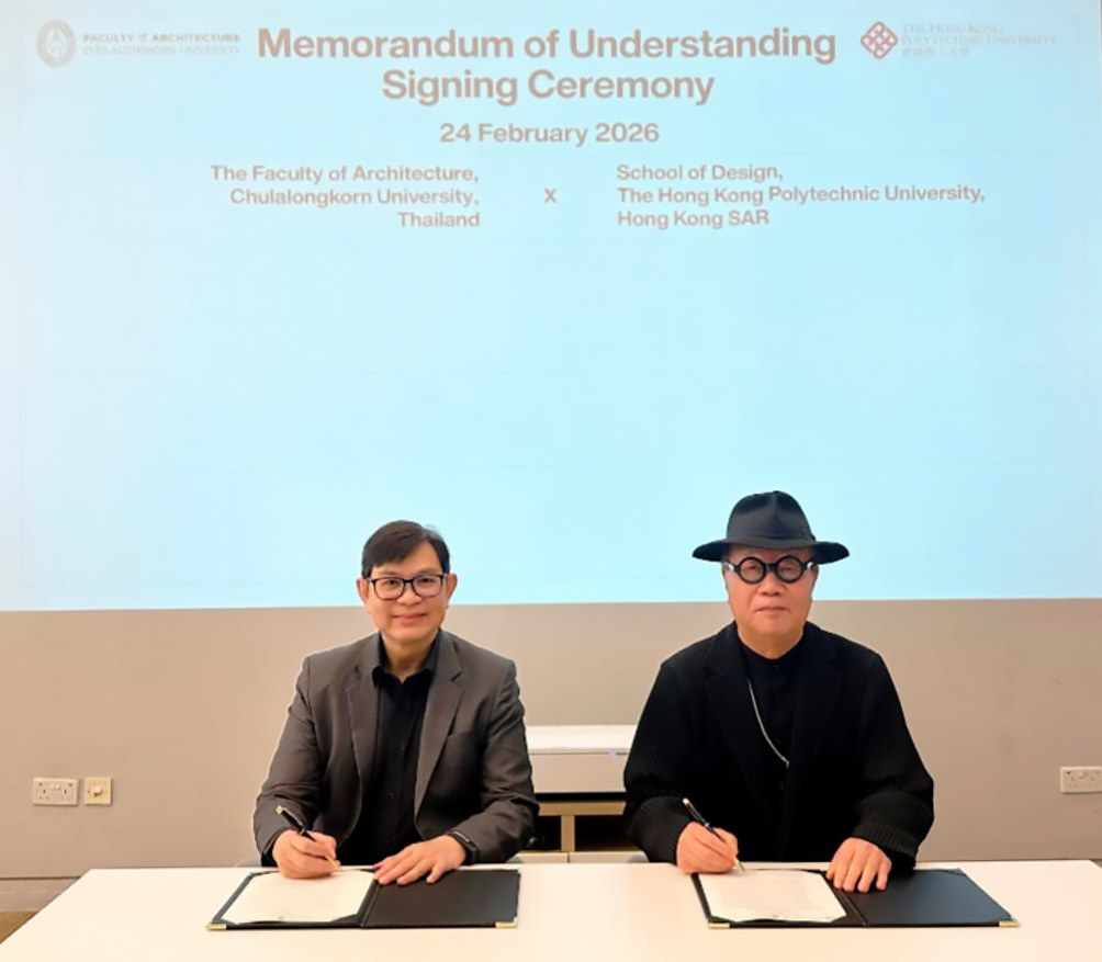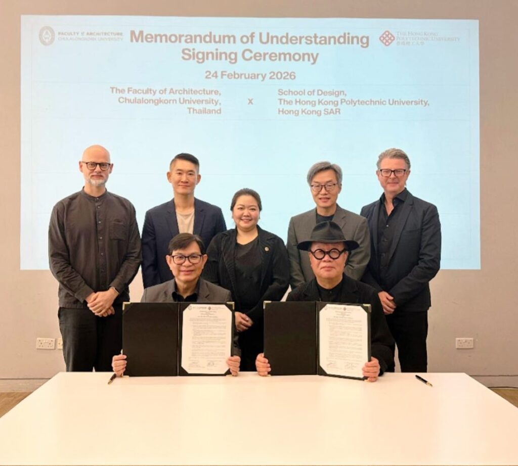 คณะสถาปัตยกรรมศาสตร์ จุฬาลงกรณ์มหาวิทยาลัย นำโดย ผศ.สรายุทธ ทรัพย์สุข คณบดีคณะสถาปัตยกรรมศาสตร์ พร้อมด้วย ผศ.ศรันยา เสี่ยงอารมณ์ รองคณบดีฝ่ายวิรัชกิจและสื่อสารองค์กร ร่วมลงนามบันทึกข้อตกลงความร่วมมือทางวิชาการกับผู้บริหาร School of Design, The Hong Kong Polytechnic University นำโดย Prof. Kun-Pyo Lee คณบดี Prof. Henry Duh รองคณบดี School of Design เพื่อเสริมสร้างความร่วมมือด้านการศึกษา การวิจัย และกิจกรรมทางวิชาการ เมื่อวันที่ 24 กุมภาพันธ์ 2569 ณ เขตบริหารพิเศษฮ่องกงแห่งสาธารณรัฐประชาชนจีน