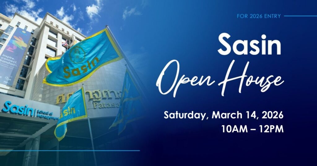 สถาบันบัณฑิตบริหารธุรกิจ ศศินทร์ แห่งจุฬาลงกรณ์มหาวิทยาลัย (Sasin School of Management) ขอเชิญผู้สนใจศึกษาต่อในปีการศึกษา 2569 เข้าร่วมงาน Sasin Open House ในวันเสาร์ที่ 14 มีนาคม 2569 เวลา 10.00–12.00 น. ณ สถาบันบัณฑิตฯ ศศินทร์ จุฬาลงกรณ์มหาวิทยาลัย