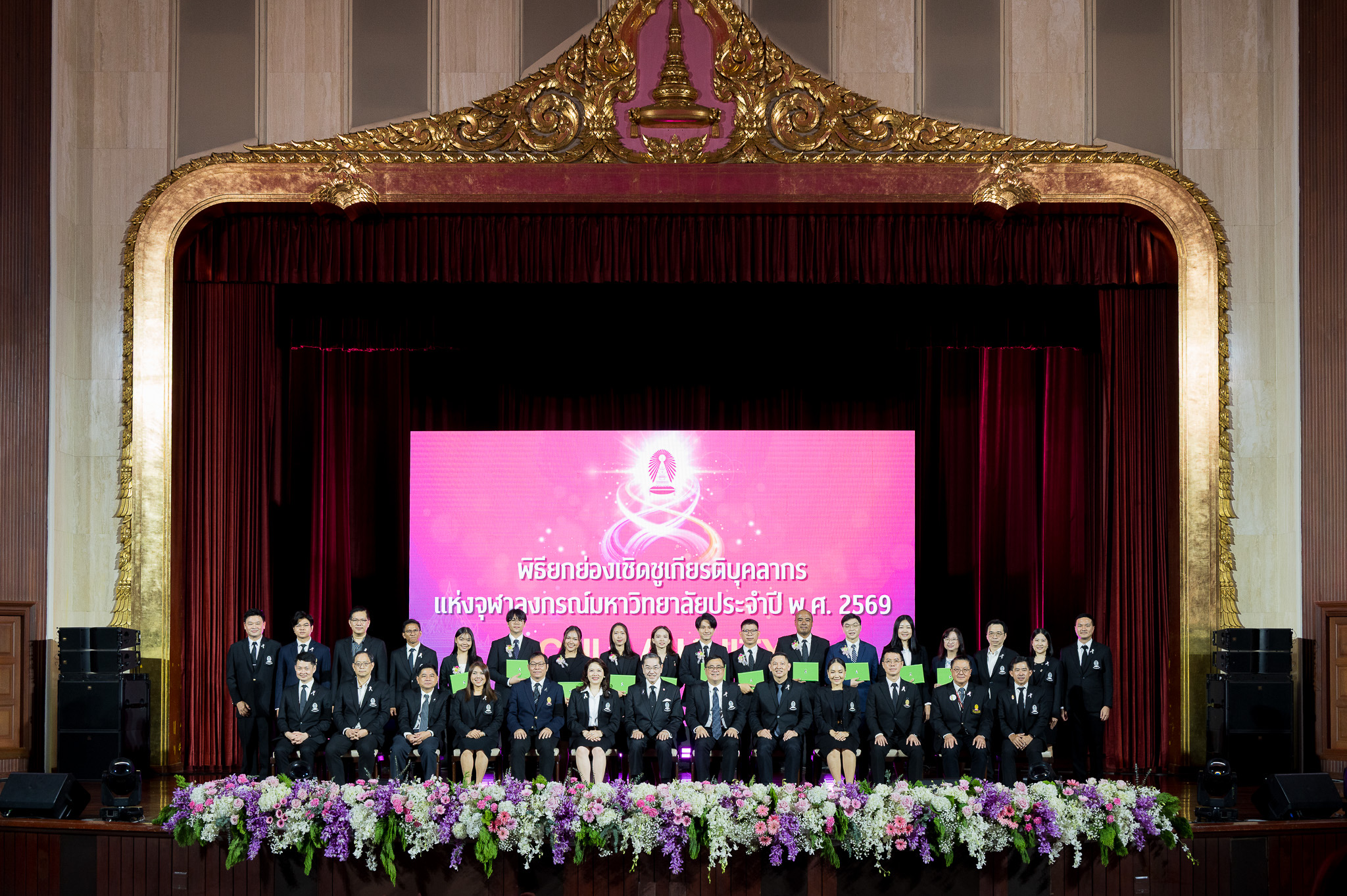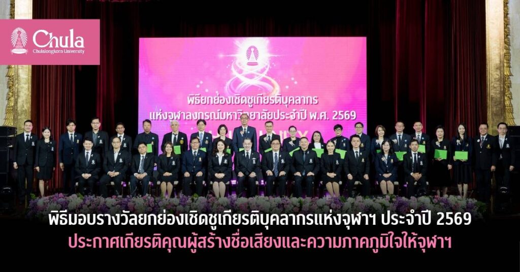 จุฬาลงกรณ์มหาวิทยาลัย โดยสำนักบริหารวิจัย สำนักบริหารวิชาการ และสำนักบริหารกิจการนิสิต จัดพิธีมอบรางวัลยกย่องเชิดชูเกียรติบุคลากรแห่งจุฬาลงกรณ์มหาวิทยาลัย ประจำปี พ.ศ. 2569 เมื่อวันที่ 11 มีนาคม 2569 ณ หอประชุมจุฬาฯ โดยมี ศ. (พิเศษ) ดร.สุรเกียรติ์ เสถียรไทย นายกสภามหาวิทยาลัย และ ศ.ดร.วิเลิศ ภูริวัชร อธิการบดีจุฬาฯ เป็นประธานมอบรางวัลยกย่องและแสดงความยินดีแก่บุคลากรจุฬาฯ ซึ่งสร้างชื่อเสียงและความภาคภูมิใจมาสู่จุฬาลงกรณ์มหาวิทยาลัย กล่าวรายงานโดย ศ.ภญ.ดร.พรอนงค์ อร่ามวิทย์ รองอธิการบดีจุฬาฯ