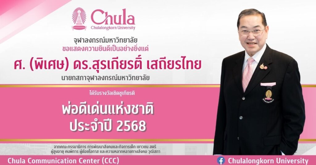 ศ (พิเศษ) ดร.สุรเกียรติ์ เสถียรไทย นายกสภาจุฬาลงกรณ์มหาวิทยาลัยได้รับรางวัลเชิดชูเกียรติ “พ่อดีเด่นแห่งชาติ” ประจำปี 2568