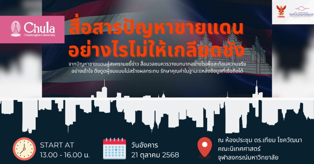 วงเสวนา “สื่อสารปัญหาชายแดนอย่างไรไม่ให้เกลียดชัง” วันอังคารที่ 21 ตุลาคม 2568 เวลา 13.00 – 16.00 น. ณ ห้องประชุม ดร.เทียม โชควัฒนา คณะนิเทศศาสตร์ จุฬาฯ
